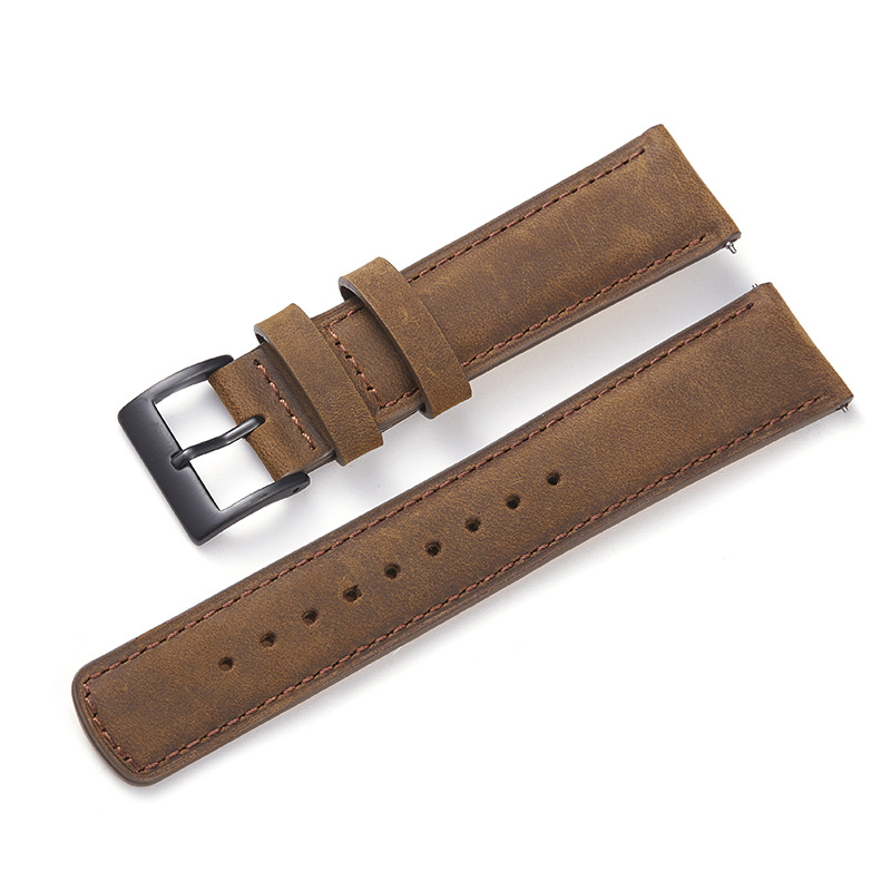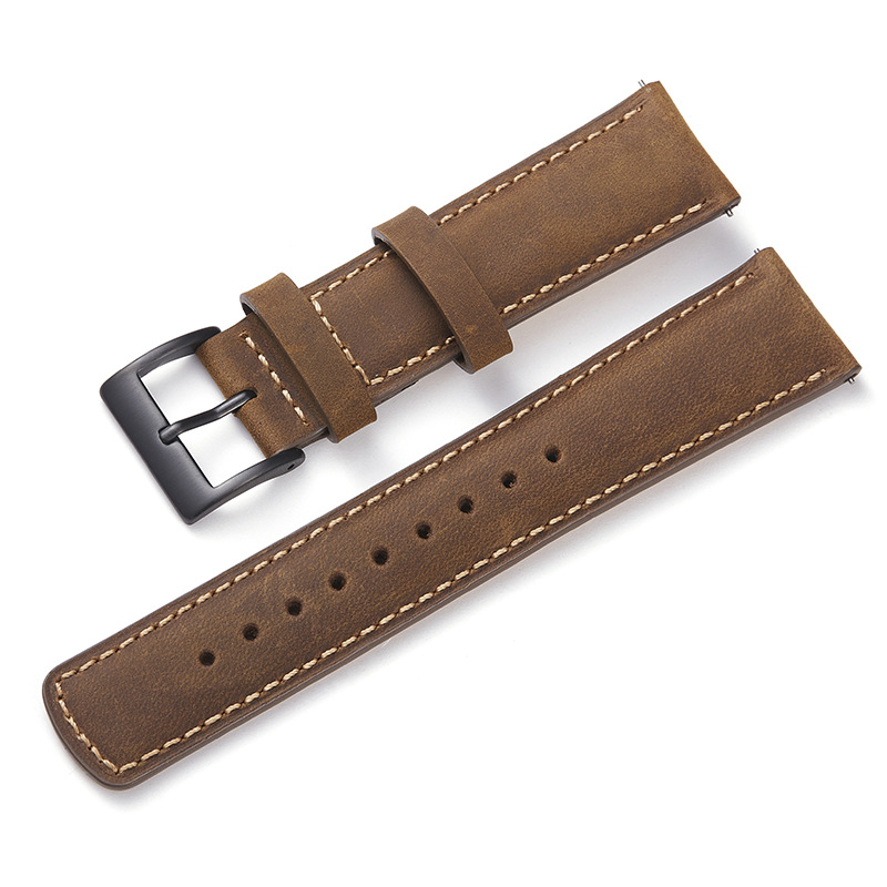 Lækker rustik læder-urrem med quick-release, beige syninger og sort eller stålfarvet spænde. Quick-release-mekanismen gør, at montering af urremmen kun tager ganske få sekunder. 22 mm-udgaven indsnævrer til 20 mm ved spændet, mens 20 mm-udgaven indsnævrer til 18 mm ved spændet.