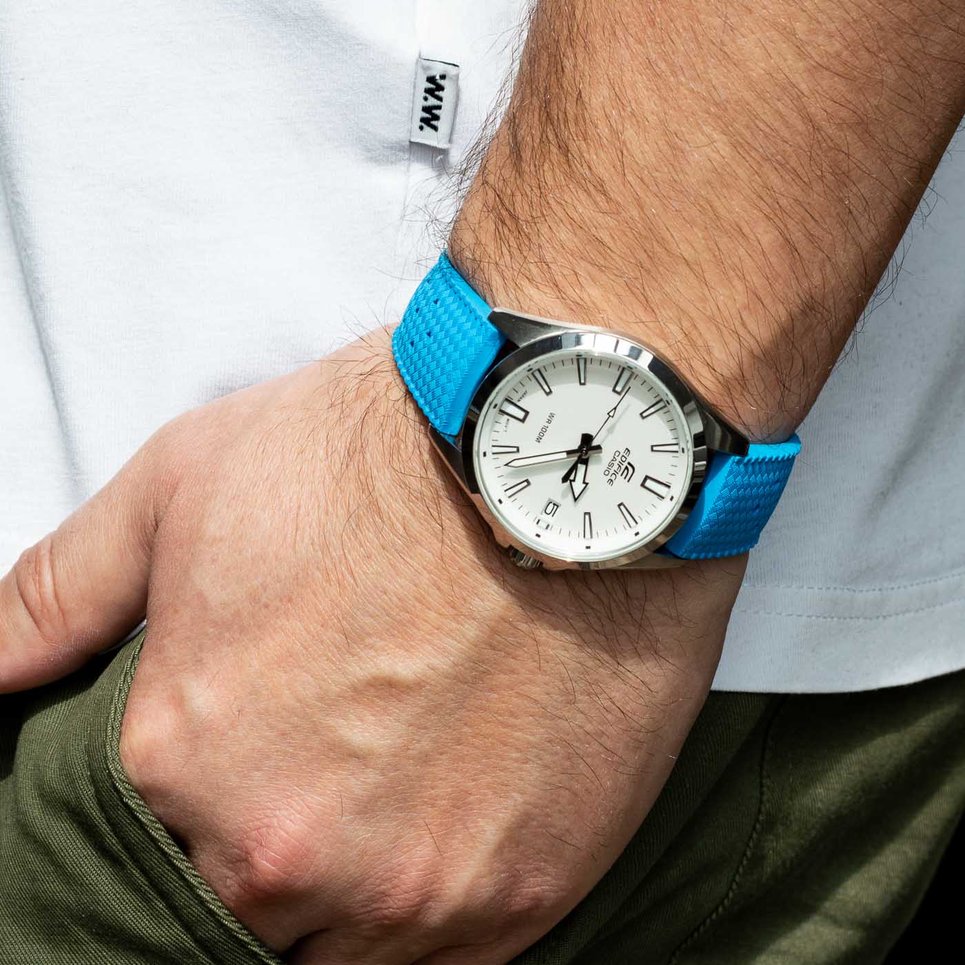 Med en dykker-urrem i tropisk stil får du et vintage dykker-look uden at gå på kompromis med komfort eller alsidighed. Og med FKM-gummi får du samtidig en meget blød, men hårdfør gummiurrem. FKM-gummi, også kendt som fluorgummi eller fluoroelastomer, er en syntetisk gummi-art, der adskiller sig fra natur- og silikone-gummi ved at have en højere densitet og kunne udstå langt højere og lavere temperaturer samtidig med, at det kan modstå flere kemiske stoffer - egenskaber som blandt andet har gjort fluorgummi til det foretrukne gummi-art indenfor luftfarts- og skibsindustrien. Fluorgummi har derfor også den egenskab, at det er mere afvisende over for støv og smuds end de gummi-arter, der traditionelt er blevet brugt til urremme.