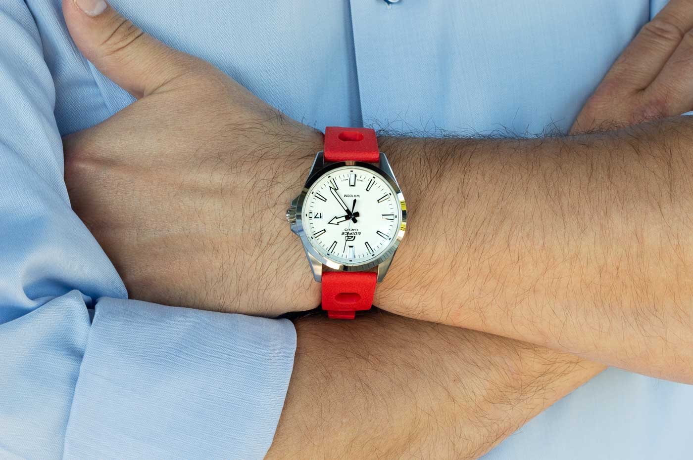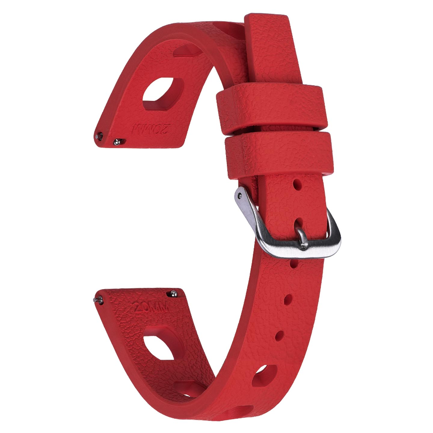 Denne gummirem har quick-release, der betyder, at du ikke skal have fat i værktøj for at skifte rem - du skubber bare låsen ned, og sætter remmen mellem hornene på uret.