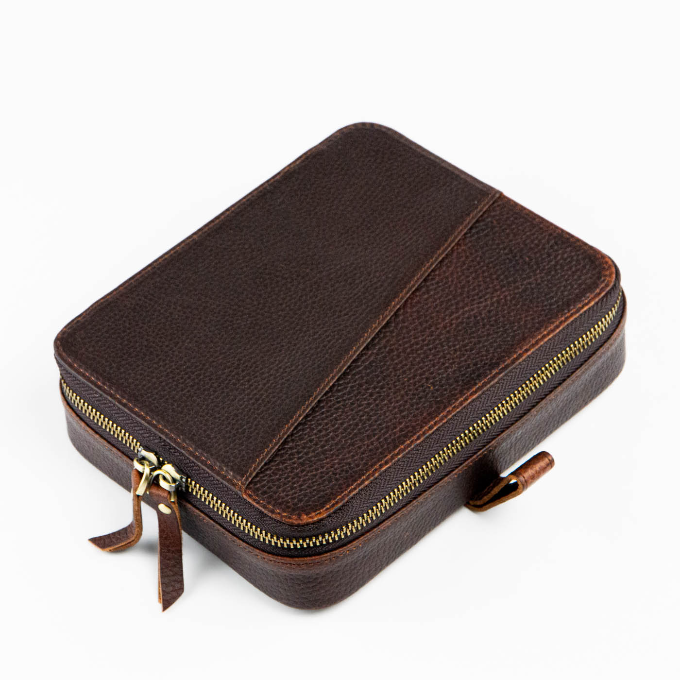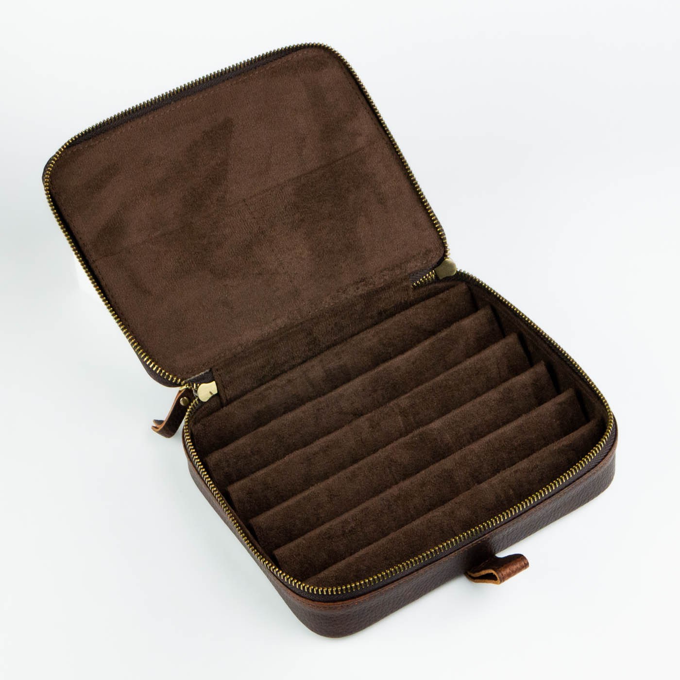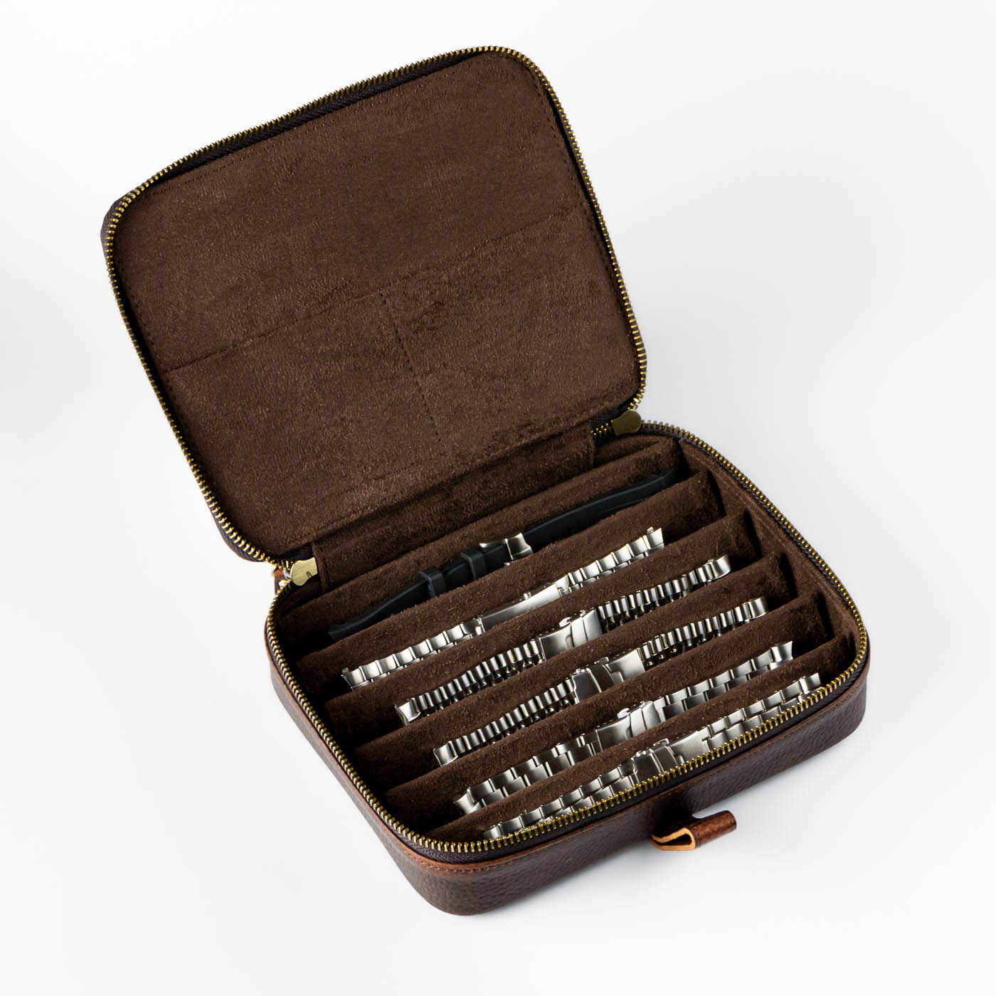 Denne lækre lædertaske til urlænker og urremme er lidt af en sjældenhed. For hvor man kan finde alverdens lækre urruller, også kendt som watch rolls, i lækkert læder til ure, der halter det mere, når det kommer til urlænker af metal. Det råder denne taske derfor bod på, da den beskytter lænker, der ikke er i brug mod at blive ridsede eller beskadigede. Samtidig gør dens kompakte størrelse, at den er let at tage med på rejser, og så ser den godt ud og føles lækker på grund af læderets høje kvalitet.
