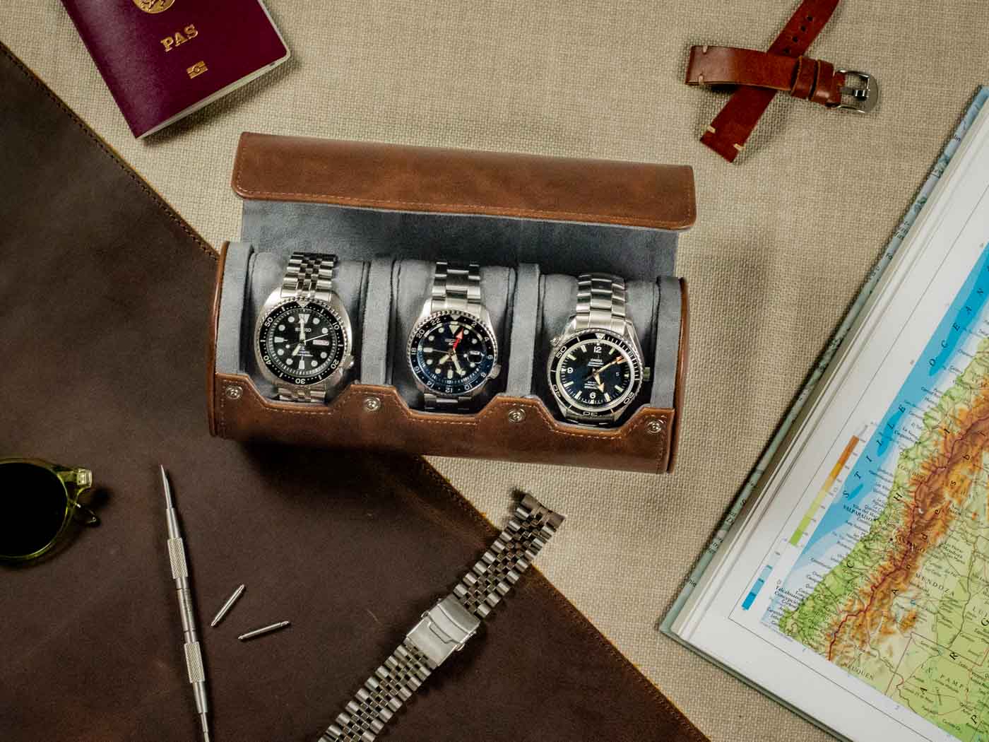 • Premium Watch Roll til tre ure - Brun
