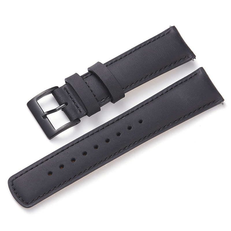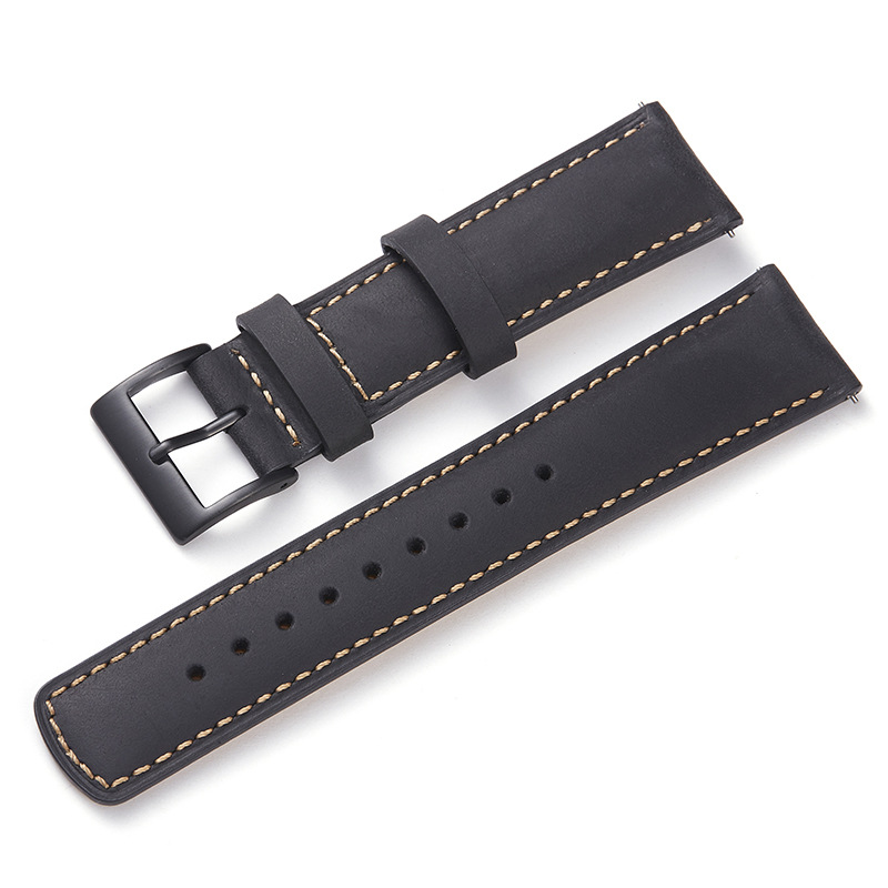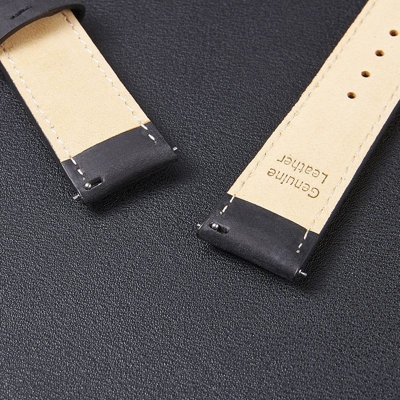 Lækker rustik læder-urrem med quick-release, beige syninger og sort eller stålfarvet spænde. Quick-release-mekanismen gør, at montering af urremmen kun tager ganske få sekunder. 22 mm-udgaven indsnævrer til 20 mm ved spændet, mens 20 mm-udgaven indsnævrer til 18 mm ved spændet.