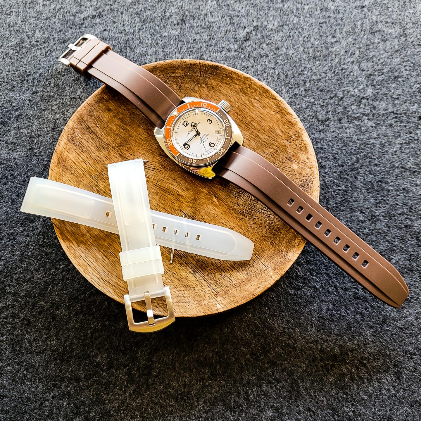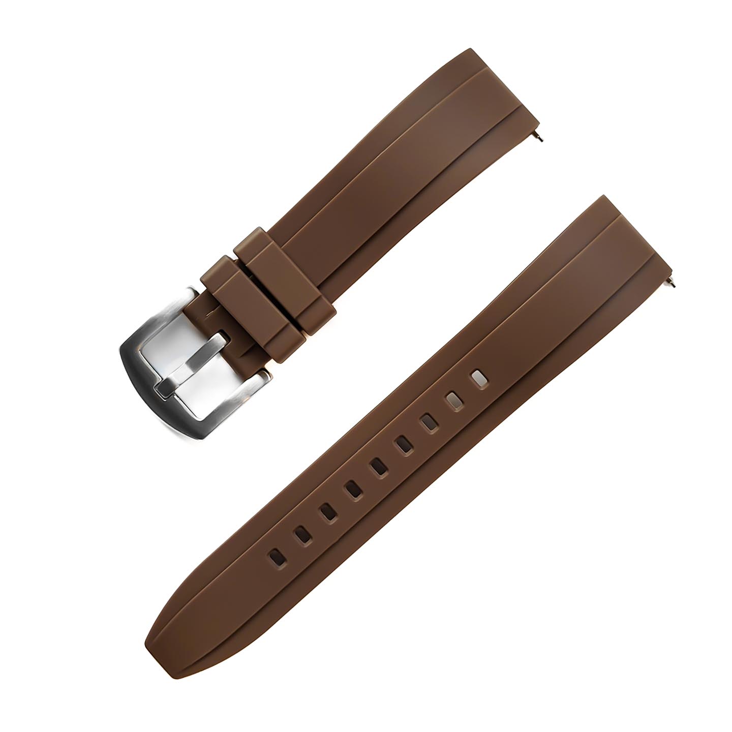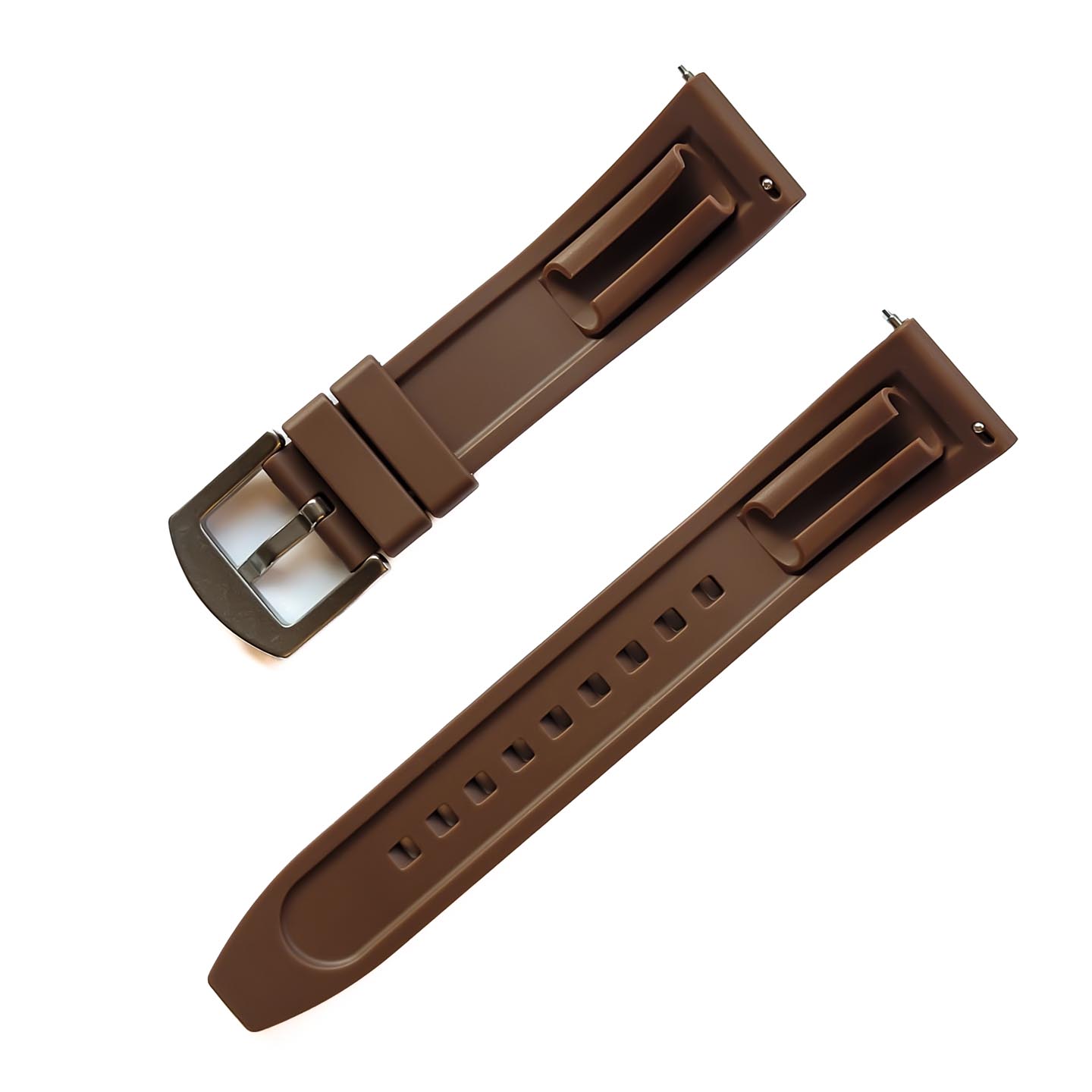 Denne brune dykker-urrem i TPSiV-silikone er glat, blød og formet så remstykkerne følger armens konturer – egenskaber som gør, at du glemmer, at du har urremmen på. Derudover er den udstyret med en indvendig ventilationskanal, der løber fra toppen og med remstykket, så håndledet køles uden at selve remmen perforeres. TPSiV-silikone er derudover en del mere smuds- og støvafvisende end almindelig silikone.