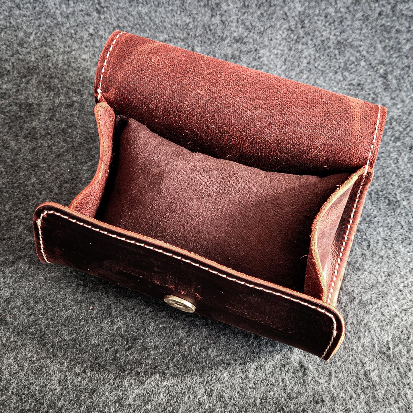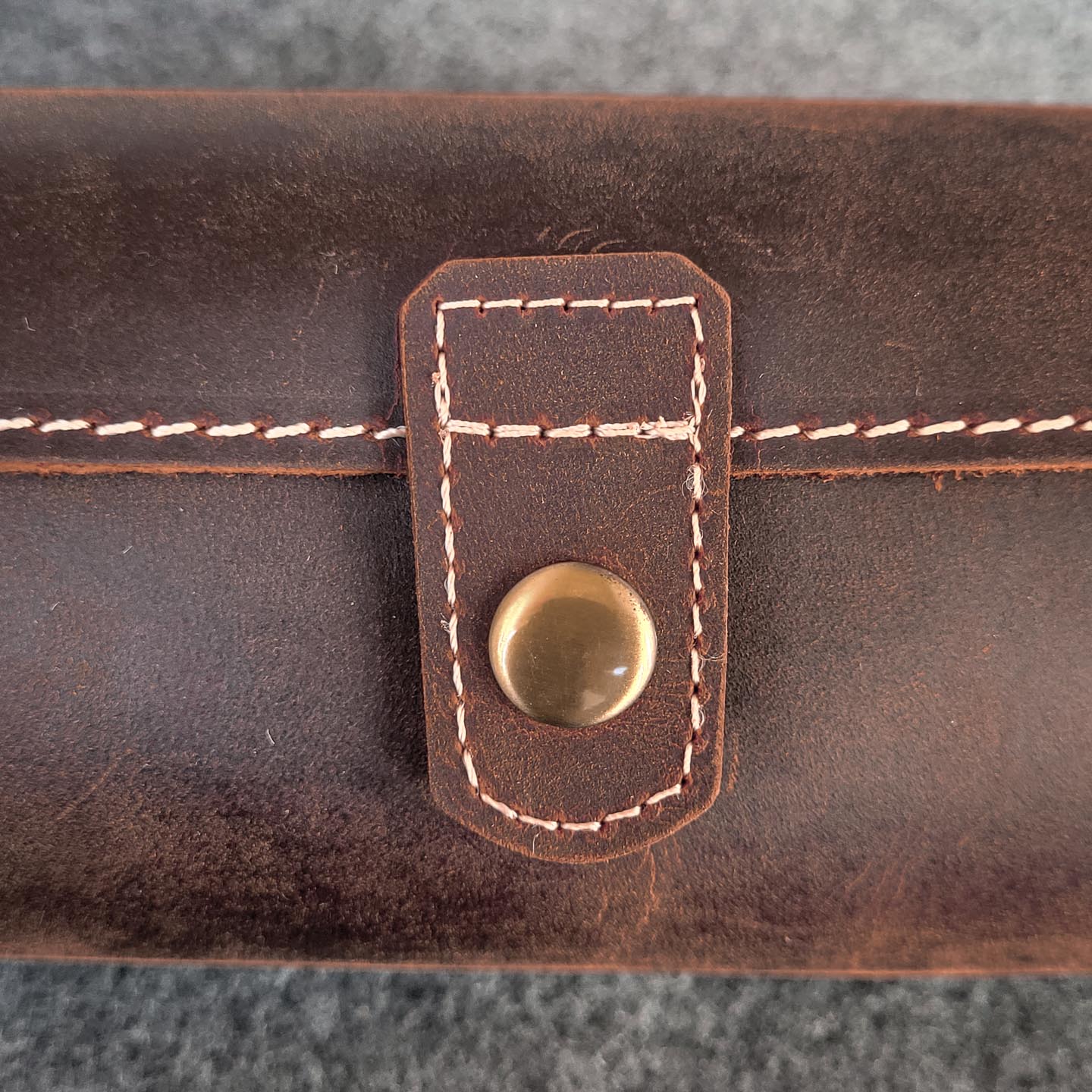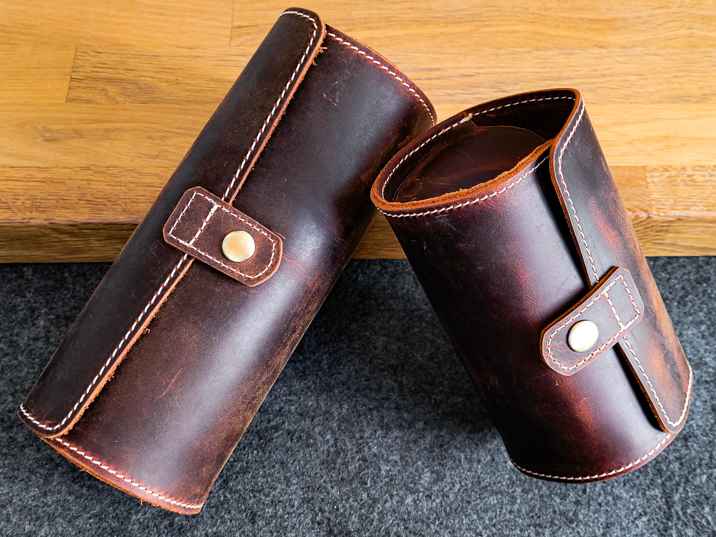 Denne lækre urrulle også kendt som en watch roll er fremstillet af lækkert, brunt læder med et rustikt udseende. Læderet har diskrete nuancer af rød og lilla alt efter lysomgivelserne. Urrene placeres på den medfølgende urpude og spændes fast. Puden lægges derefter ned i etuiet, der lukkes, således at urrene er beskyttede.