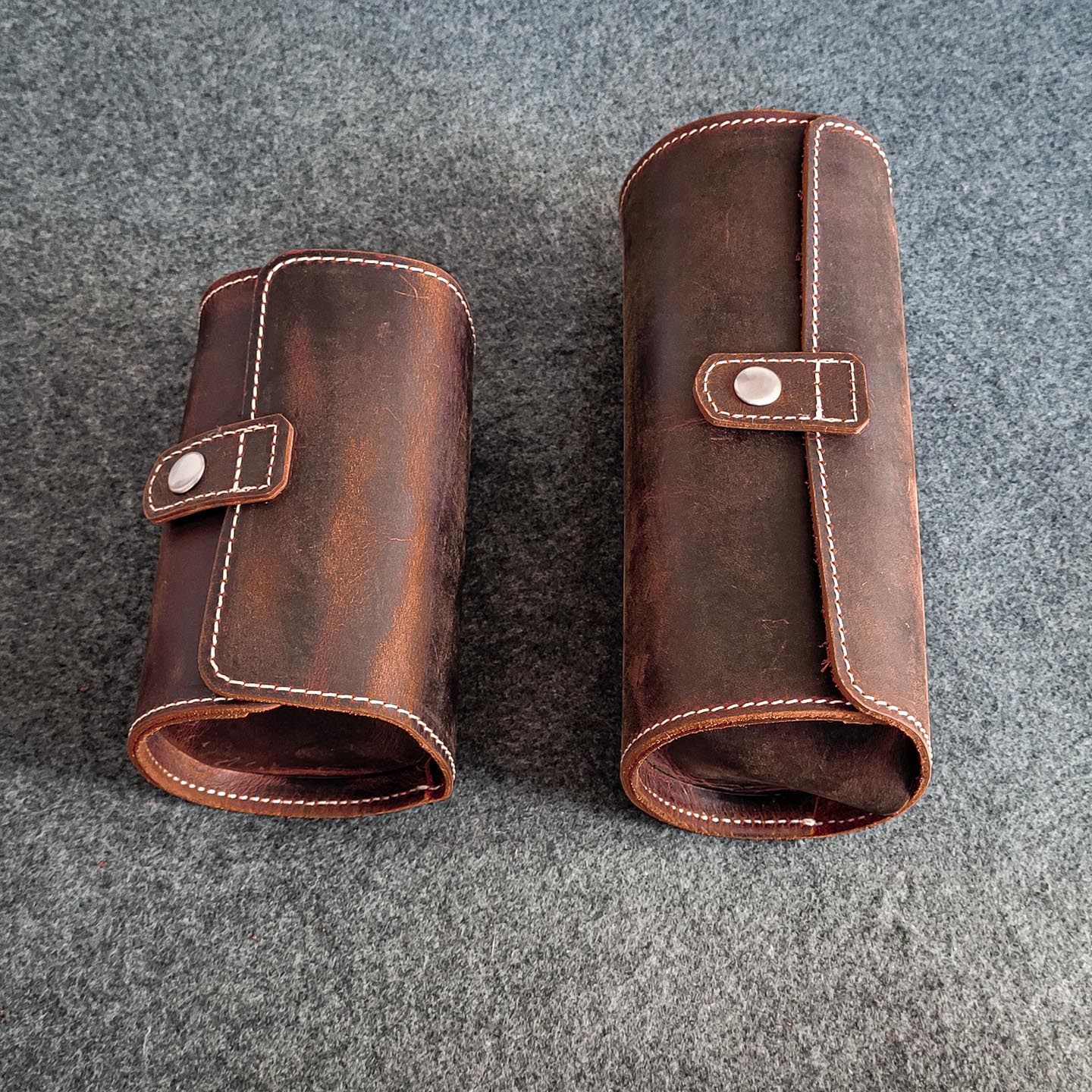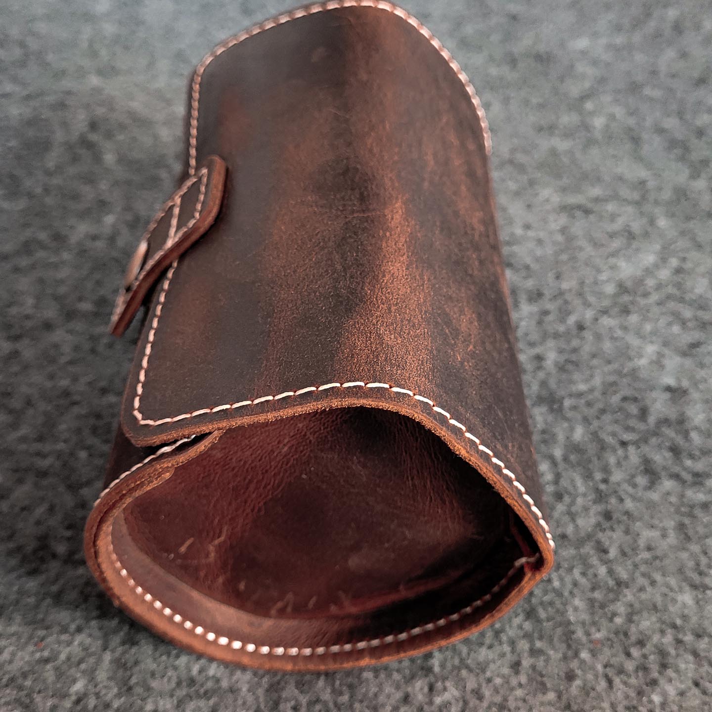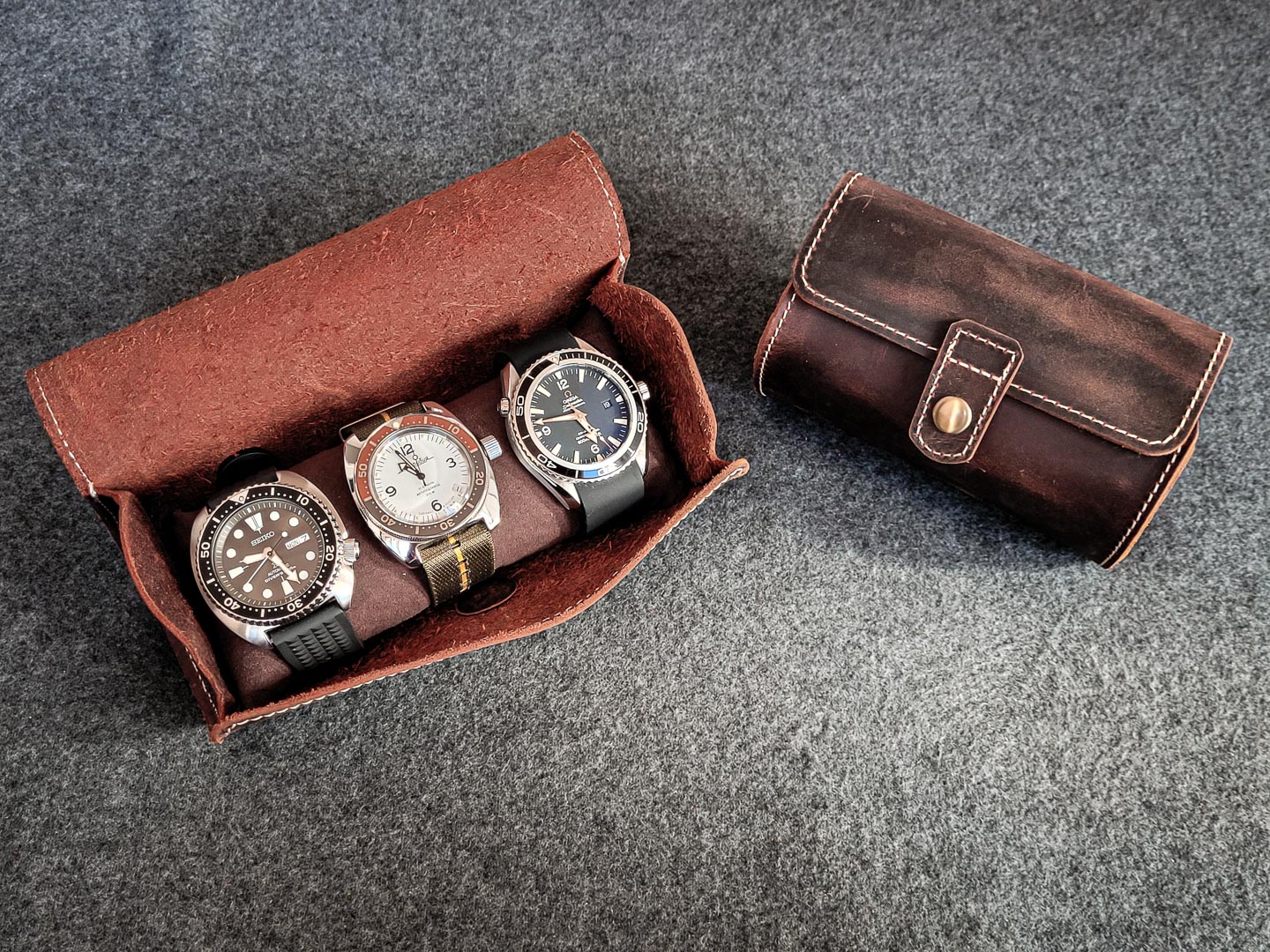 Denne lækre urrulle også kendt som en watch roll er fremstillet af lækkert, brunt læder med et rustikt udseende. Læderet har diskrete nuancer af rød og lilla alt efter lysomgivelserne. Urrene placeres på den medfølgende urpude og spændes fast. Puden lægges derefter ned i etuiet, der lukkes, således at urrene er beskyttede.