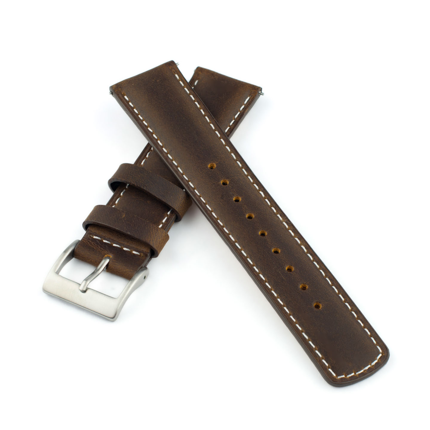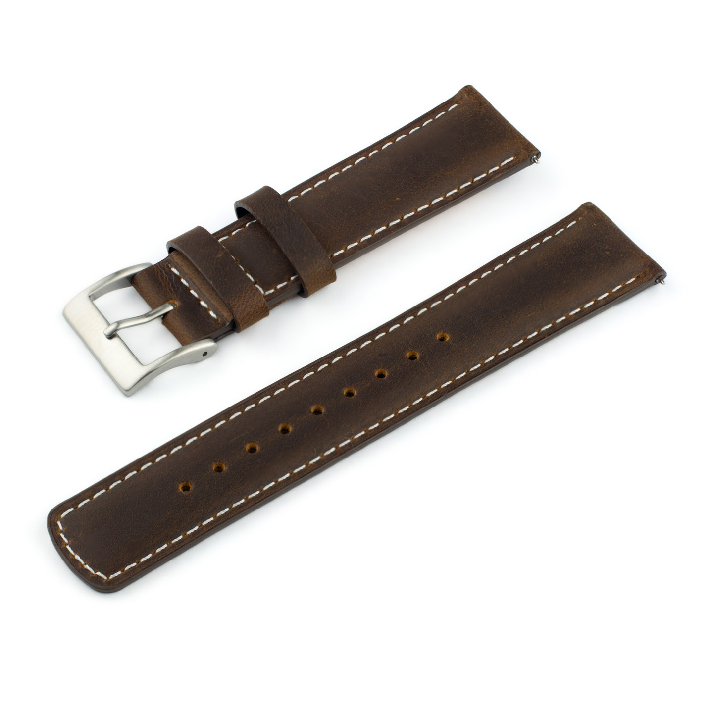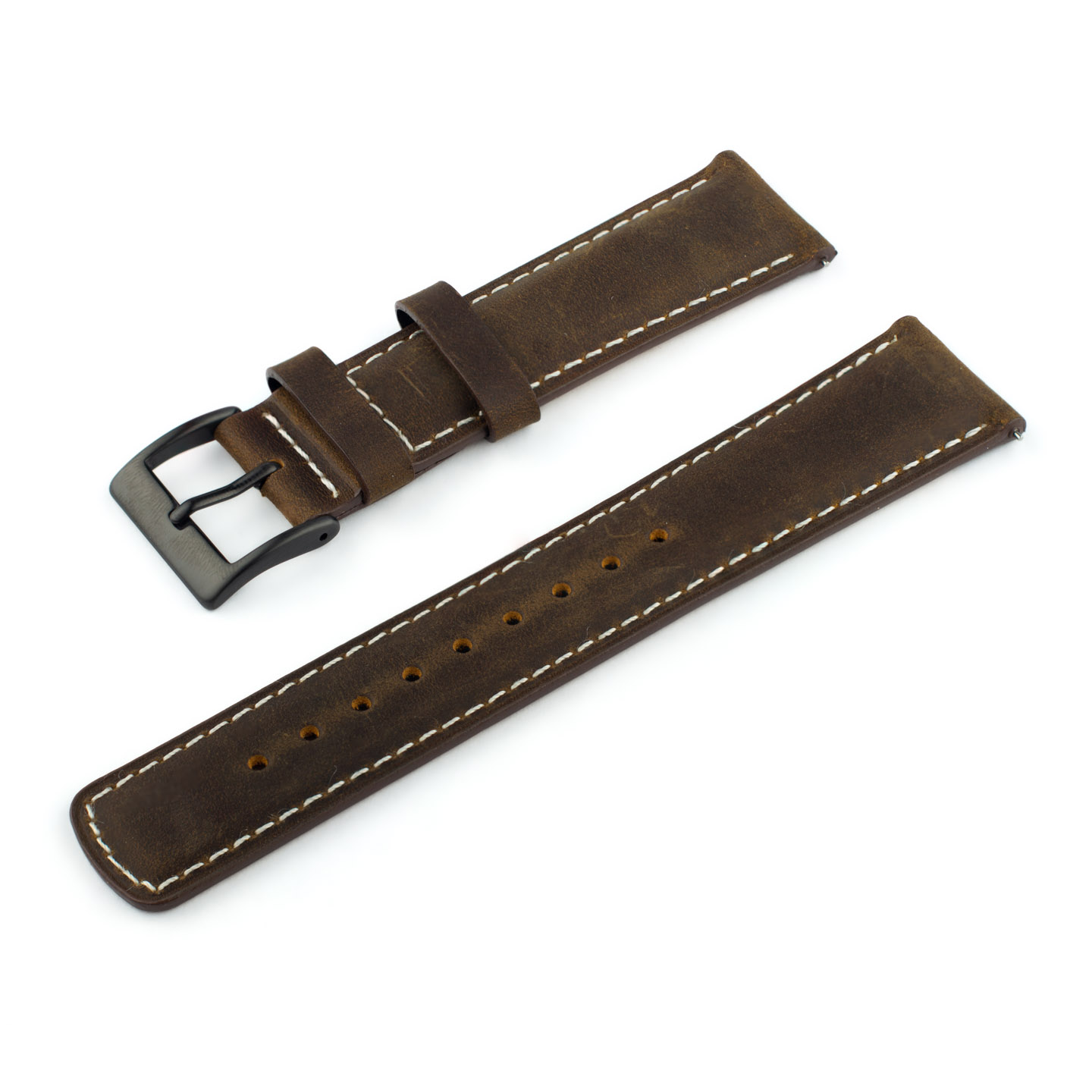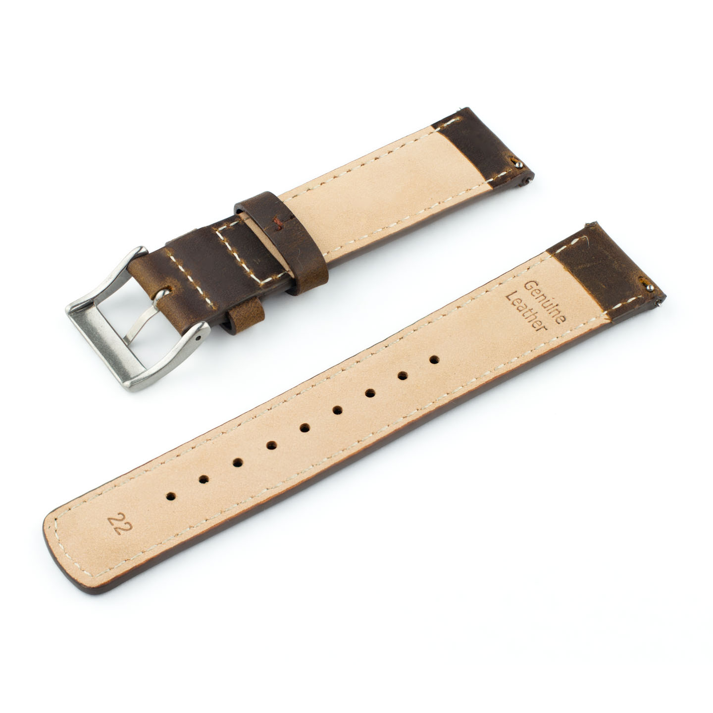 Lækker rustik læder-urrem med quick-release, beige syninger og sort eller stålfarvet spænde. Quick-release-mekanismen gør, at montering af urremmen kun tager ganske få sekunder. 22 mm-udgaven indsnævrer til 20 mm ved spændet, mens 20 mm-udgaven indsnævrer til 18 mm ved spændet.