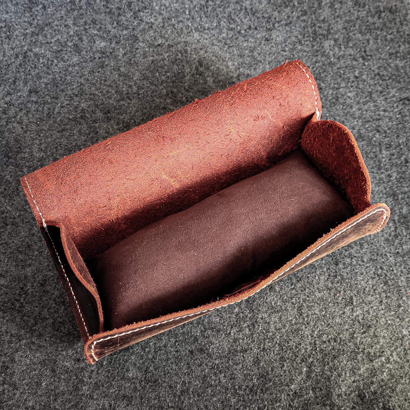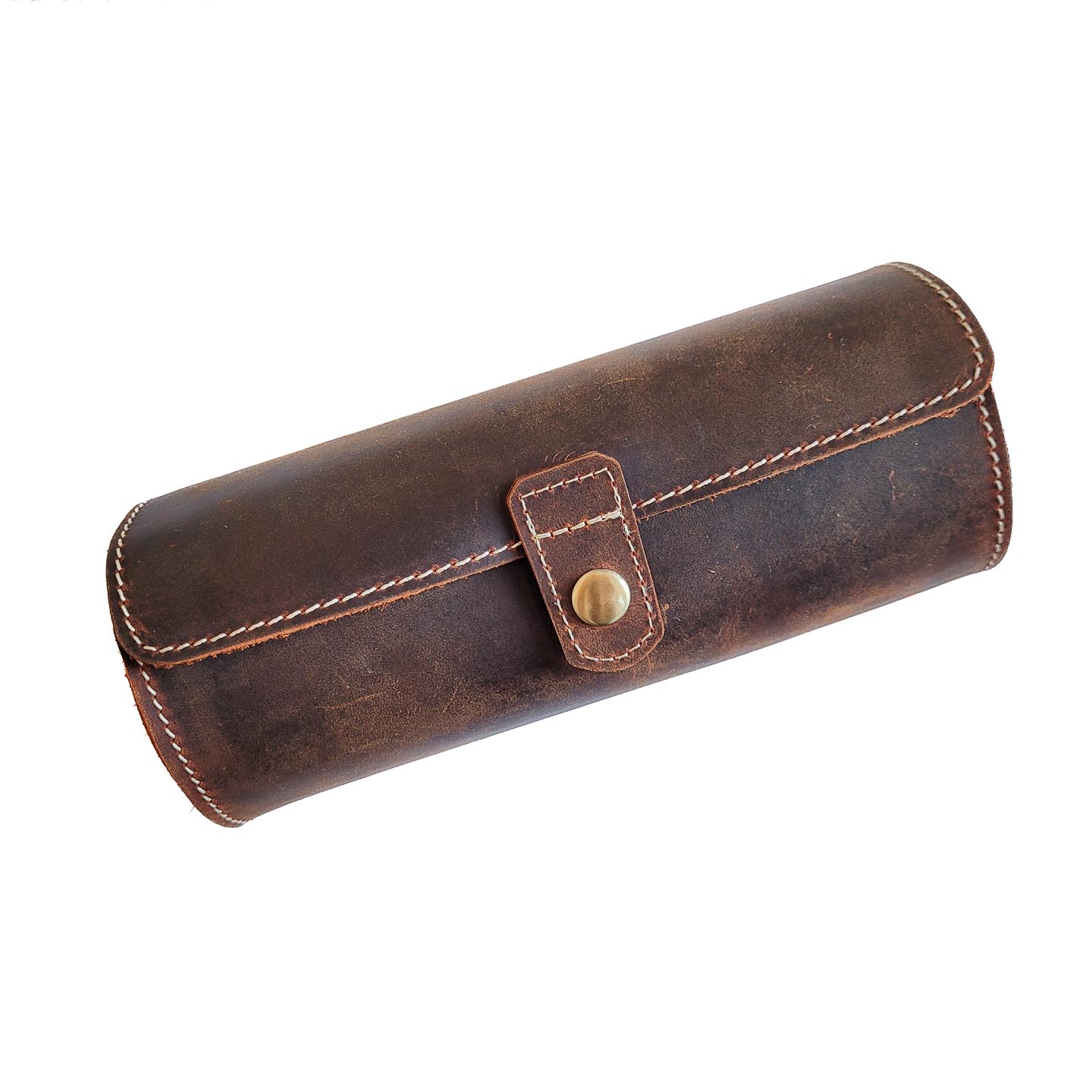 Denne lækre urrulle også kendt som en watch roll er fremstillet af lækkert, brunt læder med et rustikt udseende. Læderet har diskrete nuancer af rød og lilla alt efter lysomgivelserne. Urrene placeres på den medfølgende urpude og spændes fast. Puden lægges derefter ned i etuiet, der lukkes, således at urrene er beskyttede.