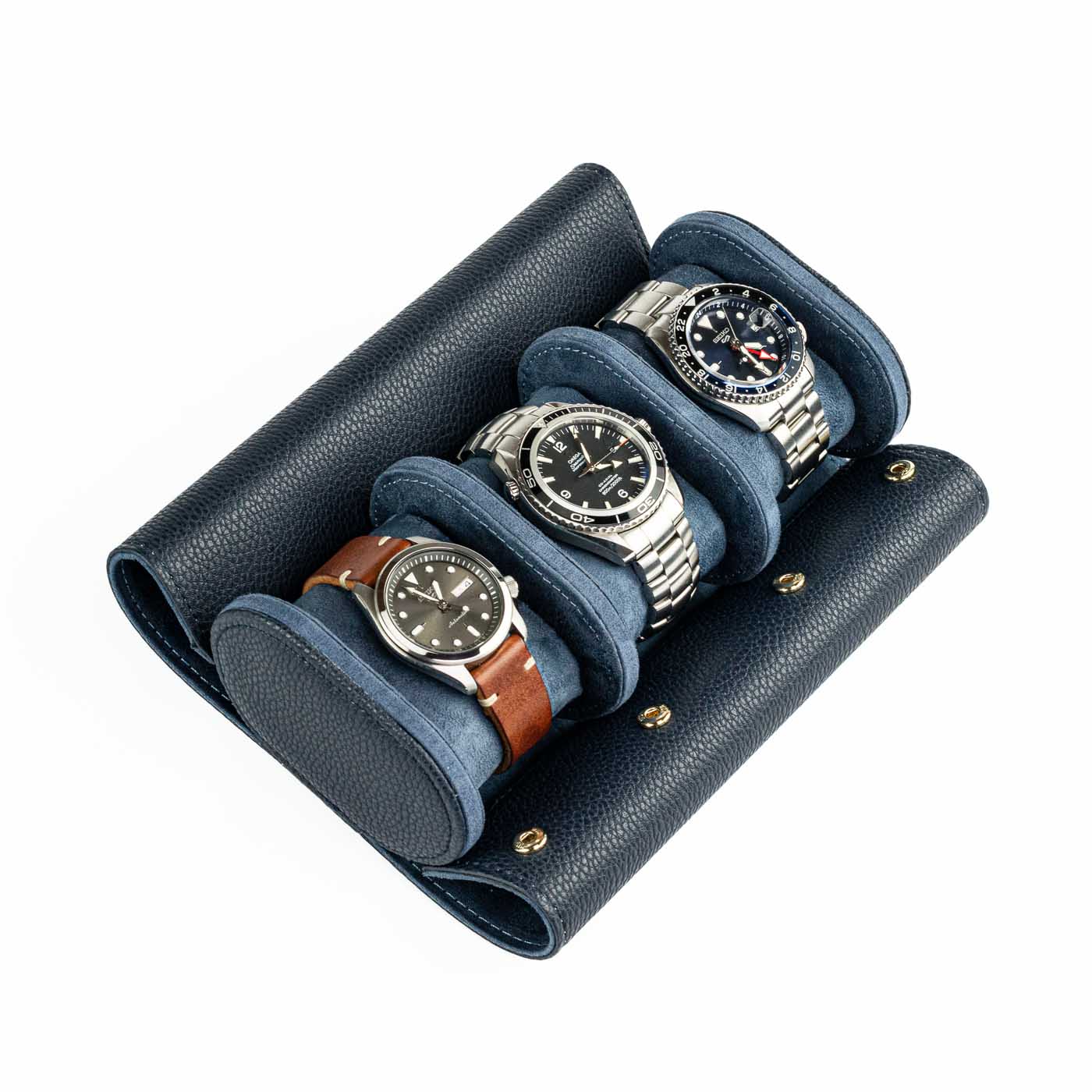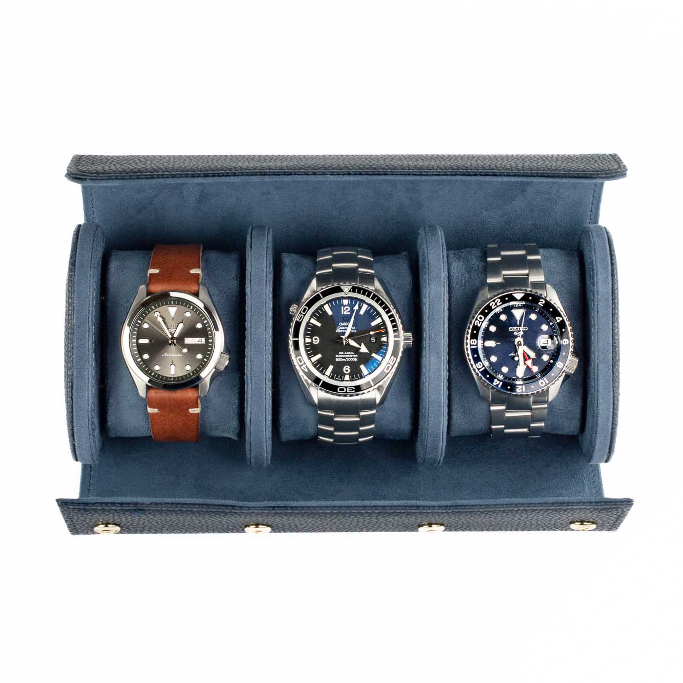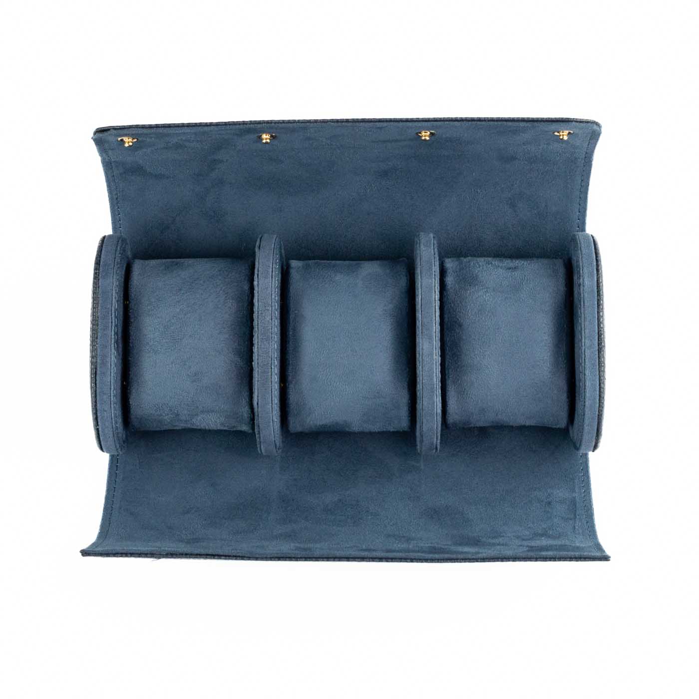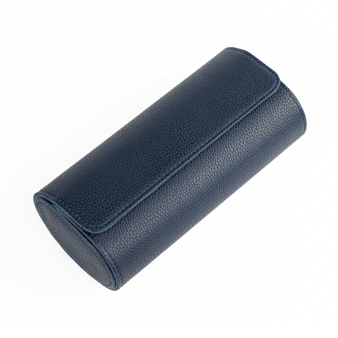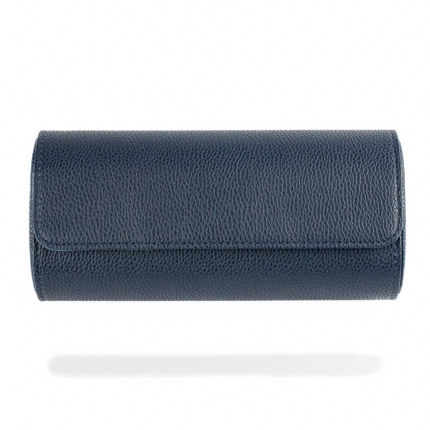 Denne blå watch roll eller urrulle til tre ure er vores bud på en value-for-money-løsning til sikker opbevaring af ure, uanset om de ligger i skuffen, på kommoden eller i kufferten, når du er på farten. For hvor en traditionel urkasse er nok er lækker, når den står statisk på et bord eller kommode, så er den ingenlunde så praktisk eller alsidig som en watch roll. Kunstlæderet er bøffelpræget, så det har et lettere rustikt tesktur og udseende.