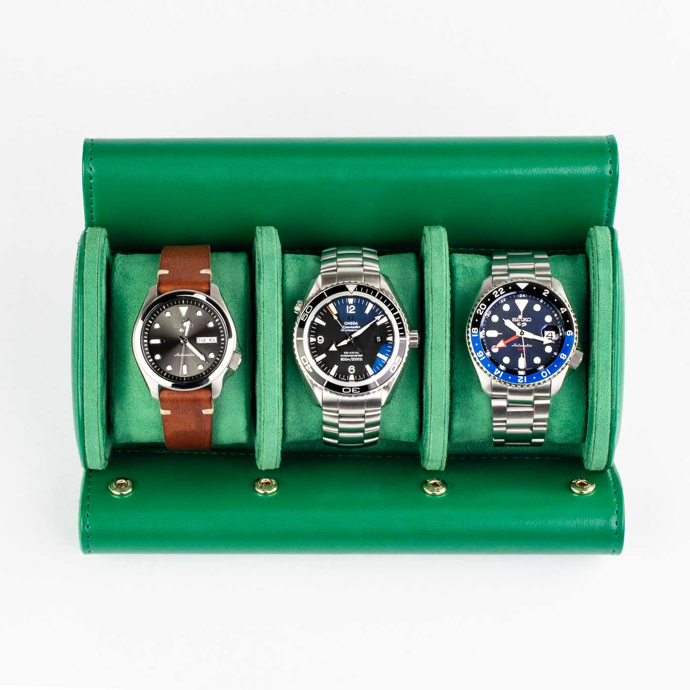 Denne grønne watch roll eller urrulle til tre ure er vores bud på en value-for-money-løsning til sikker opbevaring af ure, uanset om de ligger i skuffen, på kommoden eller i kufferten, når du er på farten. For hvor en traditionel urkasse er nok er lækker, når den står statisk på et bord eller kommode, så er den ingenlunde så praktisk eller alsidig som en watch roll.
