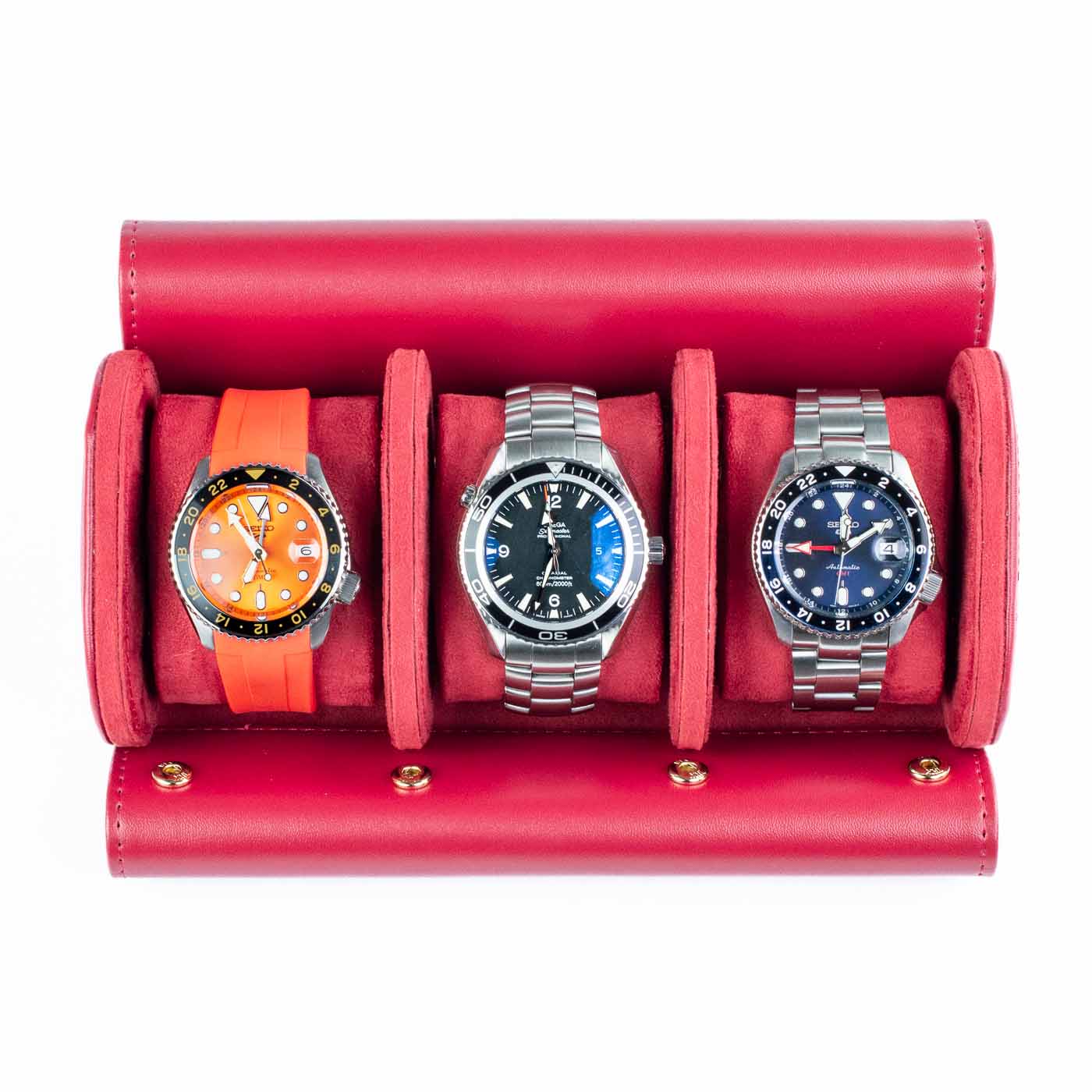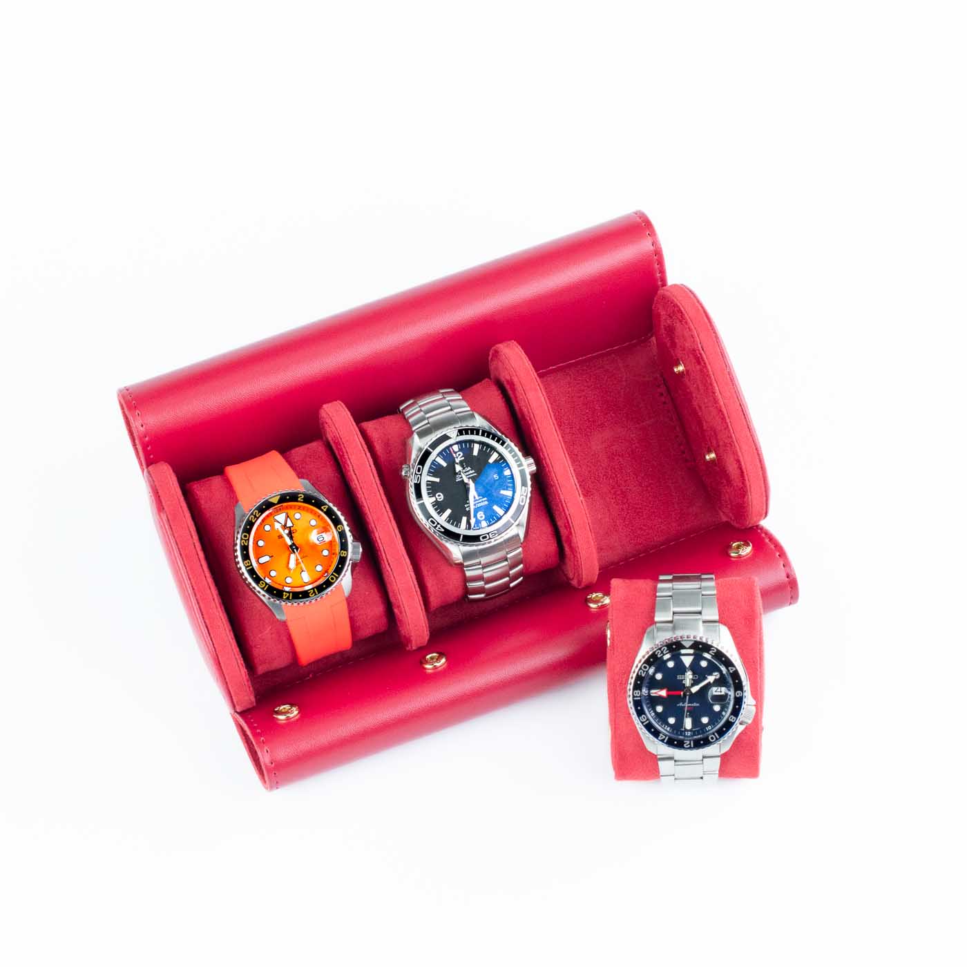 Denne røde watch roll eller urrulle til tre ure er vores bud på en value-for-money-løsning til sikker opbevaring af ure, uanset om de ligger i skuffen, på kommoden eller i kufferten, når du er på farten. For hvor en traditionel urkasse er nok er lækker, når den står statisk på et bord eller kommode, så er den ingenlunde så praktisk eller alsidig som en watch roll.