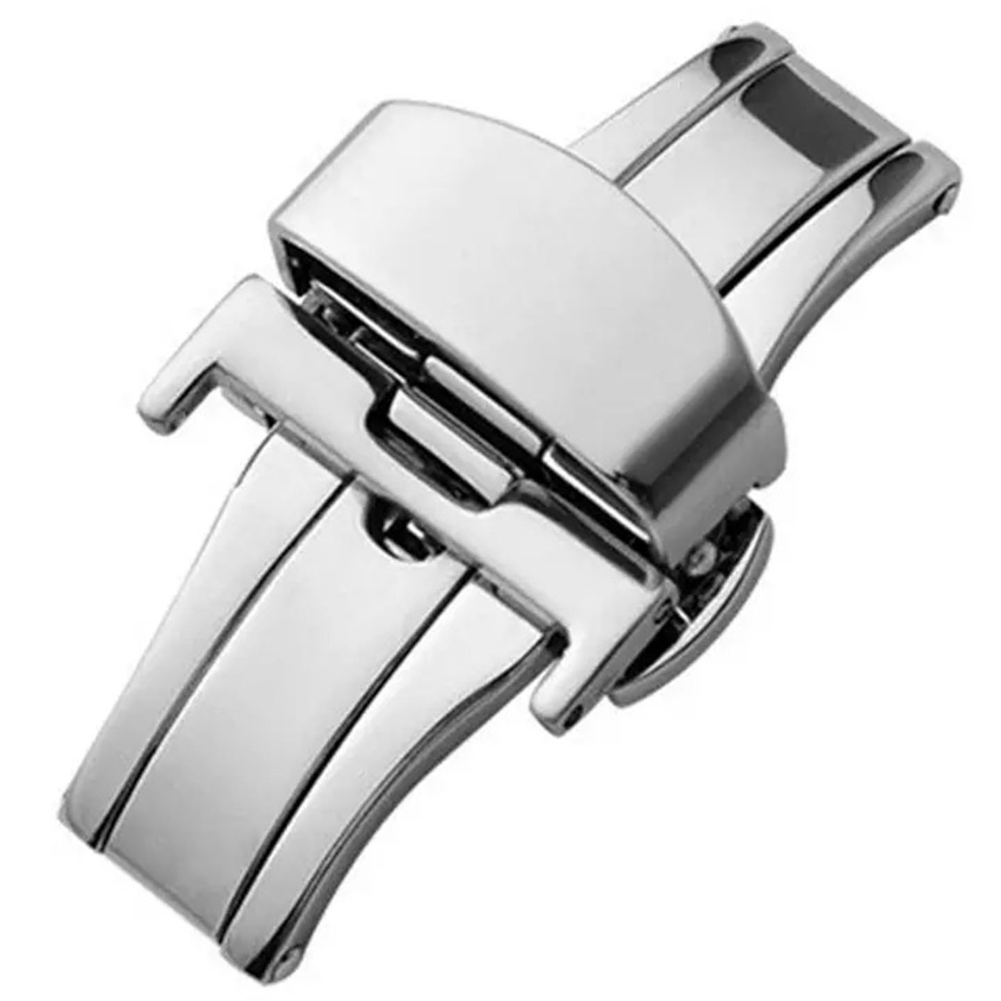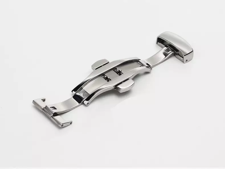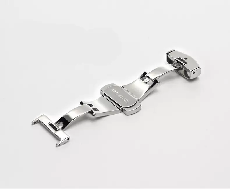 Udfræset butterfly-spænde i stål til læder-, tekstil- og gummiremme. Urspændet fås i 16, 18, 20 og 22 mm og fire farver:  Stål, sort, guldfarve og rosafarve.