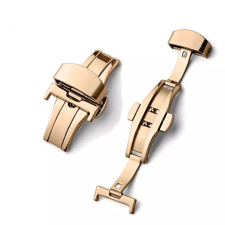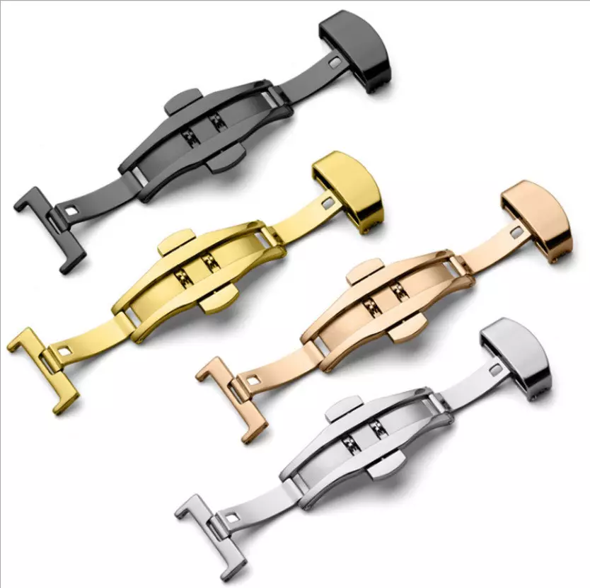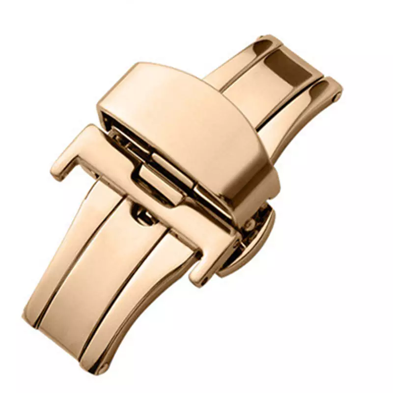 Udfræset butterfly-spænde i stål til læder-, tekstil- og gummiremme. Urspændet fås i 16, 18, 20 og 22 mm og fire farver:  Stål, sort, guldfarve og rosafarve.